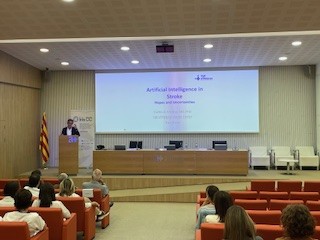 El Dr. Carlos Molina ha explicat que l’Ictus és un concepte molt complex i ha fet imaginar l’audiència sobre com podria ser el codi Ictus d’aquí a 10 anys, amb la irrupció de la intel·ligència artificial. El Dr. Molina ha explicat que el codi ictus necessita una gran rapidesa en el tractament i en garantir un diagnòstic ràpid, precís i estratificat, i ha detallat que la recerca en nous targets terapèutics i en l’atenció personalitzada, catapultades per la IA, evoluciona molt ràpid i “caldrà estar molt atent dels pros i contres” del que això suposarà. Ha explicat que la IA pot accelerar l’actitud terapèutica davant del malalt i millorar l’atenció personalitzada, implicant grans reptes i possibles aplicacions de cara al tractaments actuals i futurs.