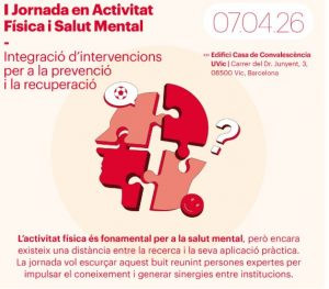 El proper 7 d’abril tindrà lloc a l’Edifici Casa Convalescència de la UVIC-UCC la primera edició de la Jornada en Activitat Física i Salut Mental, organitzada pel Grup de Recerca en Esport Activitat Fisica (GREAF), vinculat al Departament de Ciències de l’Activitat Física i al Grau de Ciències de l’Activitat Física i l’Esport de la Universitat de Vic – Universitat Central de Catalunya i adscrit a l’IRIS-CC.